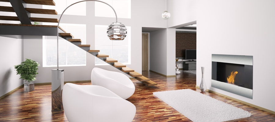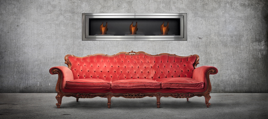 En el salón predominan los tonos del piedra, contrastados con la chimenea de bioetanol, las butacas y una mesa de centro de madera. Estores de lino, pantalla de arpillera y alfombras de yute consienten un único toque de color: el rojo intenso de la seda de los cojines. La mesa de comedor es de teca antigua, y se combinó con unas sillas tapizada de cuero negro. La chimenea decorativa obra está empotrada en la pared tiene dos burner o quemadores y utiliza bioetanol para chimeneas, no prouce olor ni humo y a sido el toque que la propietaria ha querido dar.